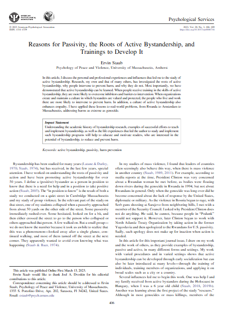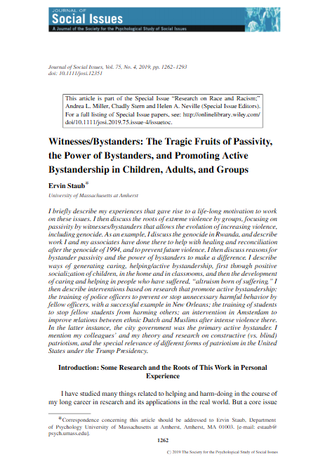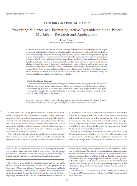 As a professor, author, and a person increasingly active in real-world settings, Dr. Staub's work broke new ground in understanding bystander behavior, genocide, and the development of caring and helping. His writings, including The Roots of Evil; The Roots of Goodness and Resistance to Evil; and The Psychology of Good and Evil became foundational texts in preventing violence and promoting peace